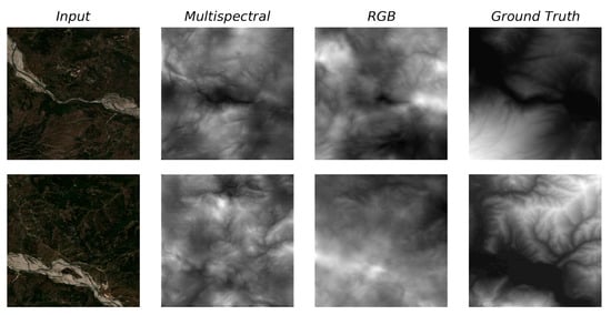The model fails to improve on average during training and evaluation using the multispectral dataset. However, we did notice it correcting some of the biases of the one trained on the RGB dataset that inevitably result from the fact that generalization on unseen data with distribution shifts is a challenging open problem in DL that requires special attention to be mitigated [68,69,70,71,72,73,74]. In particular, as shown in Figure 9, we observe that some river banks are assigned larger values than expected from the models, probably due to the coloration that resembles peaks, shaded slopes or snow. The model trained on the multispectral dataset receives more information and manages to partly correct the artifact.