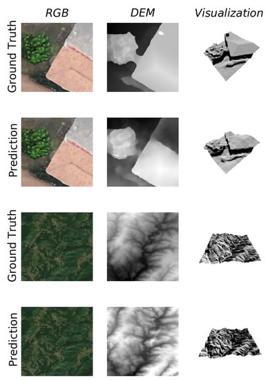 Given that DL algorithms are task agnostic, meaning that one can readily extend an algorithm or a model to accommodate another task, albeit some limitations exist, we can use the very same techniques to study the inverse problem, i.e., train the inverse operator, , to predict the surface coloration, meaning the RGB image, conditioned on a DEM. Note that simply “inverting” the generator G is not an option, as it is NP-hard to do so [79]. This generator is useful in itself, with applications like automated terrain generation (see Figure 13), but it is also useful as a regularization technique for our original generator. In more detail, several works [57,80] have deployed the inverse generator to force the original generator to preserve enough semantic information during the mapping between one domain to the other-in our case, from remotely sensed imagery to DEMs-so as to render the result informative enough for the inverse generator to be able to reconstruct the original input from it. In other words, we can use the generated DEM as input to the inverse generator and task it with mapping it to the original observation space, its corresponding remotely sensed image. We comment on the performance of such a technique, similar to the one presented in [57], in comparison to pix2pix and other baselines in Section 3.4.