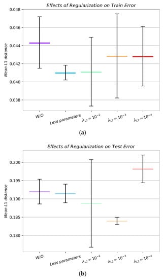 Quantitative effects of no regularization (W/O), L2 regularization () and diminished capacity (Less parameters) on train and test error of the normalized to satellite-imagery dataset. Absolute metrics can be seen in Table 2. All metrics represent distances in that range. Note that, due to resource constraints, we a priori reduce the capacity of all the models presented above, and no data augmentation (Section 2.8) is used. For more representative results of the unregularized model, refer to Figure 8. (a) We can see that, almost surprisingly, the training errors of the regularized models are on average better that the unregularized one, though all their ranges overlap. (b) We can observe statistically significant improvement of the error of some regularized models over the plain model. Note the large gap (variance) still in train and test performance, indicating overfitting. 2000 samples are used to calculate test error.
