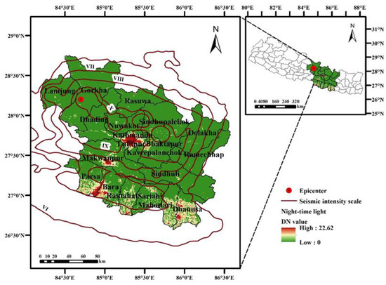 Nepal is a landlocked country in the Himalayan plateau of South Asia. Its terrain is high in the north and low in the south. From north to south, the terrain consists of mountains, mountain valleys, and plains. Nepal is one of the least developed countries, with agriculture being the largest industry in Nepal. In April 2015, a 7.8 magnitude earthquake struck Nepal, killing 8790 people and injuring 22,300 [39]. Moreover, it destroyed a large number of buildings and infrastructure in urban and rural areas, caused traffic jams, hindered rescue and recovery work, and seriously affected the social and economic development of Nepal [40]. The study area is shown in Figure 1.