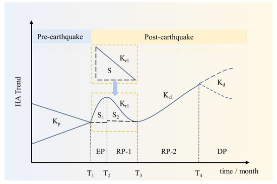 The speed and the quality of recovery process must be monitored [51]. From Figure 3, we know that the PNLP pattern was divided into two parts: pre-earthquake and post-earthquake. We developed the Kp (pre-earthquake development rate), which reflects the changing levels of HA intensity before the earthquake. Kr1 (recovery rate) reflects the changing levels of HA intensity in RP-1. Kr2 (reconstruction rate) reflects the changing levels of HA intensity in RP-2. Kd (development rate) reflects the changing levels of HA intensity in DP. Krp (relative reconstruction rate) is a relative quantity, and it reflects the changing levels of HA intensity relative to the pre-earthquake HA level. S (loss) reflects the amount of HA loss during the EP and RP-1. In order to better analyze the changes in HA at various stages, we defined the parameters in Table 1.