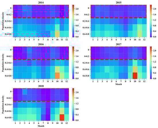 From Figure 4, the mean of DN value can be observed in different population density. We know that as population density increased, so did the DN value. When we compare the DN values between different months, we can see significant differences. However, for one month, there was no obvious difference in the mean value between no population (=0) and low population (0–0.2). This may be due to the inability of NTL to monitor low HA areas [58]. As the population density increased, the mean value increased. In this study, low population density was not considered. Therefore, we utilized the mean value of 0.2–0.4 population density level as the threshold to distinguish background noise from HA. Background noise trend is shown in Figure 5.
