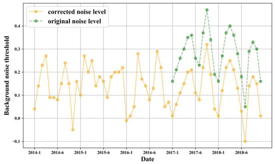From Figure 5, we know that the trend of background noise is dynamic. Moreover, it was clear that since 2017, the original noise level had increased significantly. We can see that after we subtracted the step factor, the corrected noise level was basically the same. In order to compare the denoising effect, the images of January 2015 and January 2018 were selected, as shown in Figure 6.