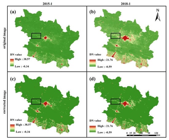(a) The original and (c) corrected images in January 2015; (b) the original and (d) corrected images in January 2018.