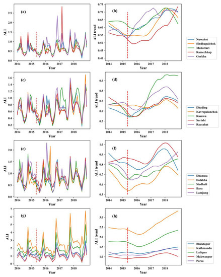 The original ALI curve has obvious fluctuations and there are certain limitations in studying the dynamic trend of HA (Figure 7a,c,e,g). The ALI trend acquired from the STL algorithm clearly showed the change trend of HA (Figure 7b,d,f,h): in the months around April 2015, HA showed significant changes. This change could have been caused by the Nepal earthquake in April 2015, with the post-earthquake recovery process being the main reason for the trend change.