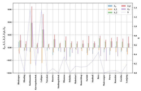 Kp was in a relatively stable range (from −0.01 to 0.01) in most areas. The fastest developing area before the earthquake was Bhaktapur (kp = 0.009), while Rasuwa, Parsa, and Dolakha were the areas with the slowest development (kp < −0.01).