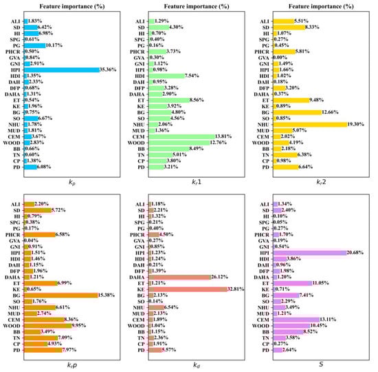 From Figure 9, we can observe that the development before the earthquake was influenced by many factors. The factors affecting kp were mainly HPI (35.36%) and PG (10.17%). For kr1, the main influencing factor was CEM (13.81%), WOOD (12.76%), and ET (8.56%). The kr2 was also influenced by multiple factors, which were NHU (19.30%), BG (12.66%), ET (9.48%), and SD (8.33%). Compared with kp and kr1, disaster data (SD) became the main factor affecting kr2. In RP-1 and RP-2, energy source (ET) was always the main factor. Compared with the RP-1, although the influence of building type reduced in RP-2, the influence of the number of housing units (NHU) occupied the main position. In other words, architecture was the main factor affecting the recovery process [40]. The krp was influenced by multiple factors, including BG (15.38%), WOOD (9.95%), CEM (8.36%), PD (7.97%), and TN (7.09%). The main factors affecting kd were KE (32.81%) and DAHA (26.12%). Energy source was always the main factor affecting the recovery process. However, compared with other phases, agriculture became the main factor affecting DP. This may have been because agriculture is the main economy mode of Nepal, so the level of agriculture affects the level of post-earthquake development. The main factors affecting S were HPI (20.68%), CEM (13.11%), ET (11.05%), and WOOD (10.45%).