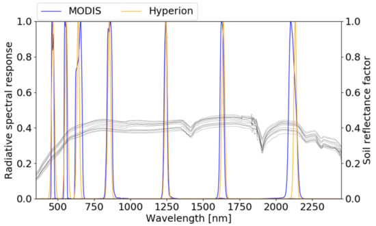 where is the band k (k = 1, 2,…, 7 for MODIS, and k = 29, 50, 12, 21, 110, 149, or 198 for Hyperion) specific soil reflectance for the sensor m (can be MODIS or Hyperion) derived from , which is the soil reflectance profile along the wavelength () measured by the ith in situ observation (i = 1, 2,…, 11); RSRk,m is the RSR for band k and sensor m. The integration was conducted at the spectral resolution of the in situ observation (1 nm).