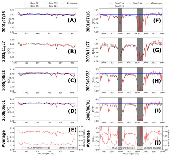RCCCs of CALother with reference to CALother,sim. (A–D) are the results for the VNIR region on the day indicated along the left axis, and (F–I) are the results for the SWIR region. The black lines are the RCCCs simulated from each reference band, the red solid line is the averaged value of the nearest neighbor CALother,sim (see Section 2.4), and the blue line shows the unity (i.e., the ideal quality in CALother). (E,I) describe the 18-day temporal average (solid lines) of the RCCCs and their temporal standard deviations (dashed lines) for the VNIR and SWIR regions, respectively. The gray masks show uncertain spectral regions due to strong water vapor absorption.