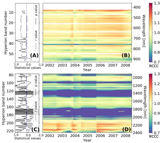 Heatmap of the time series RCCCs for each Hyperion band (B,D) and the statistical significance in their temporal trends (A,C). (A,B) are for the VNIR bands, and (C,D) are for the SWIR bands. In (A,C), the correlation coefficient (r) and p-value of the linear regression of the RCCCs over time are shown. The blue line is the statistical significance level of the p-value (p < 0.05). Strong water absorption bands are masked by the gray rectangle in the SWIR region. In (B,D), the analogous bands used in the previous cross-calibration (Hyperion bands 12, 21, 29, 50, 110, 149, and 198) were excluded from the plot. The spline function interpolated the gaps between the image acquisitions.