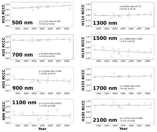 Time series of the RCCC for Hyperion bands at wavelengths 500, 700, 900, 1100, 1300, 1500, 1700, and 2100 nm. The linear regression line was drawn, and its mathematical expression with the correlation coefficient (r) and p-value was described over the plots. The explanatory variable (x) in the linear regression is the Unix time of the data acquisition.