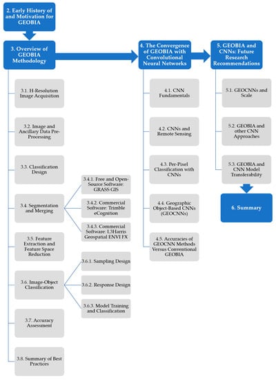 The primary objectives of this paper are to: (i) guide novice practitioners in performing GEOBIA; (ii) describe how the field is evolving with respect to methodological considerations, including integration with CNNs; and (iii) provide recommendations for future research directions. As outlined in Figure 1, the remainder of this paper discusses the early history of and motivation for GEOBIA (Section 2), the methodological workflow (Section 3), the recent convergence of GEOBIA with CNNs (Section 4), and future directions (Section 5). Section 6 provides a summary. Table A1 provides a list of acronyms used in this paper. We note that Section 2 and Section 3 provide background and methodological guidance regarding the conventional framework of GEOBIA, which includes standard approaches that have been developed by 20+ years of research. Because these sections were primarily written for novice practitioners, we intentionally kept this practical guidance separate from the newer, less-standardized integration of GEOBIA with CNNs—Section 4 and Section 5 will discuss this emerging form of GEOBIA.