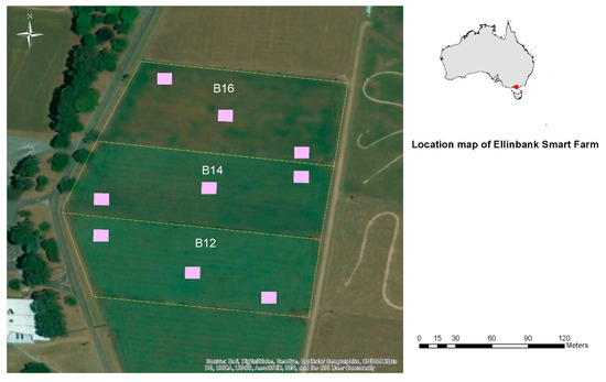 Location of B paddocks (Yellow boundary) and associated 10 × 10 m sampling areas (purple squares) that were used to select three sub-samples for destructive sampling (Image source: ESRI, World Imagery).