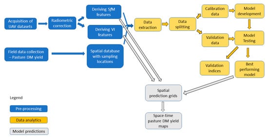 There is untapped potential to utilise rich datasets gathered through Unmanned Aerial Vehicle (UAV)-borne systems for measurement and subsequent management of pasture production systems. These UAV-borne systems provide very high-resolution datasets at the paddock scale and have other advantages over passive remote sensing systems such as satellite datasets, fewer issues with atmospheric correction and removing the impact of clouds on data availability. Quantification of biomass using UAV-associated technologies is not new. There has been a great deal of work associated with quantification of crop biomass over the last decade using UAV-derived datasets [15,16,17]. In comparison to crop production systems, grazing production systems do not have the luxury of synchronised continuous growth and harvest, where the latter is often disturbed through intermediate grazing or cutting herbage for forage conservation. As such, spatial-temporal modelling of pasture DM yield at the paddock scale is far more challenging.