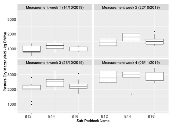 The mean pasture DM yields for the B paddocks were reported as 1013 kg DM/ha (±285 s.d.), 1596 kg DM/ha (±347 s.d.), 2223 kg DM/ha (±502 s.d.) and 2843 kg DM/ha (±447 s.d.) for measurement (sampling) weeks 1–4 respectively. Mean DM yield and its distribution measurement across the three sub-paddocks at each sampling date are depicted in Figure 3. There is an inherent spatial variation of pasture DM yield across the paddocks. The mean pasture DM yield for sub-paddock B14 was higher than for sub-paddocks B12 and B16 at each sampling time (Figure 3). The strip chart that shows the individual measurement with respect to pixels with each sub-paddock and with time is included in supplementary Material (Figure S3).