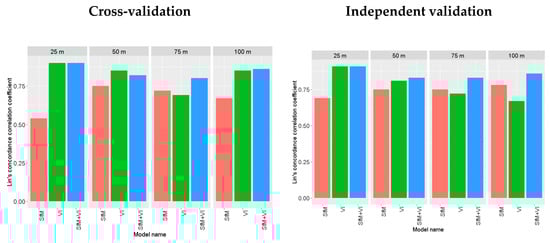 The graphical summary of the model quality evaluation using Lin’s concordance correlation, RMSE and normalised RMSE for three tested models with respect to four flying altitudes. Results are summarised for both leave-one-out cross-validation and independent validation.