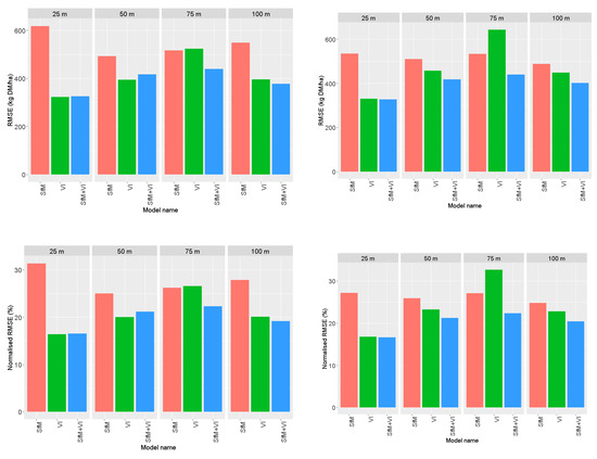 In summary, the best performing models for each flying altitude all reported LCC values greater than 0.80; RMSE less than 440 kg DM/ha, and normalised RMSE less than 23%. Out of all models tested, the SfM+VI model developed using data gathered from 25 m flying altitude was the best performing model with a LCC value of 0.91, and an RMSE of 327 kg DM/ha and a normalised RMSE of 16.6% (Figure 4; Supplementary Material; Table S2). Generally, the VI only and SfM+VI models reported similar model quality with little improvement gained by adding SfM features, flying at 75 m being the only observed exception.