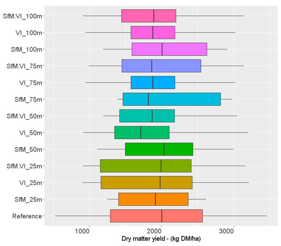 Evaluation of different model prediction capabilities with respect to the reference pasture dry matter yield in an independent validation test. All models were validated using the same independent samples (n = 20) for meaningful comparison. The horizontal black line within the boxplot depicts the estimated mean value in each case.