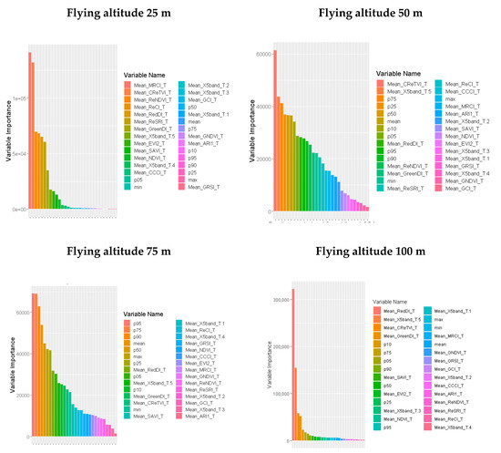 The variable importance plot (VIP) associated with each fitted random forest model indicates the contribution of each feature towards the prediction of pasture DM yield. The VIP for the best performing model at each flying altitude is shown in Figure 6. Although SfM+VI models were chosen as the best performing models for all four of the flying altitudes tested, there were no SfM-derived features included within the top 10 most important features for the 25 m model (Figure 6). In contrast, the best performing models for the altitudes of 50, 75 and 100 m did rely on SfM-derived features within their top 10 most important features (Figure 6). The VIP plots for other models tested in current work (SfM only and VI only) are included in supplementary material Figure S5 (for SfM only models) and Figure S6 (for VI only models).