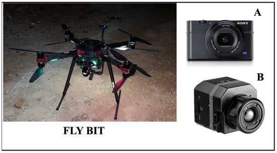 FlyBit octocopter and equipment. (A) Sony Alpha 6000 camera; (B) FLIR VUE PRO R thermal imaging camera.
