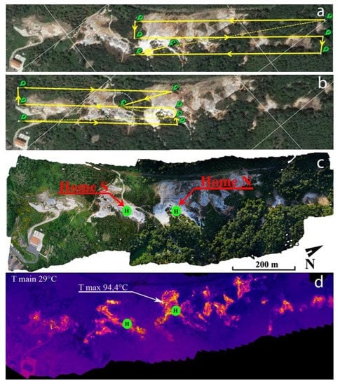UAV flight of 19 June 2019 on the Parco delle Biancane: (a) flight plan for the northern sector; (b) flight plane for the southern sector; (c) visible mapping; (d) thermal mapping. The “Home” (H) indicates the take-off point of the UAV which has a ground elevation of 621 m and 610 m in the northern and southern sector, respectively.