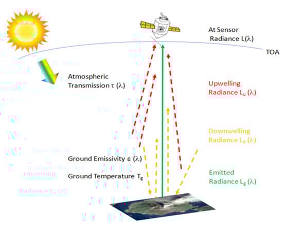 The surface temperature retrieval is obtained by applying the Radiative Transfer Equation (RTE) of [] and inverting the Plank’s law, Equation (1):