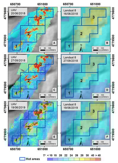 Maps of land surface temperature of UAV (A,C,E) and Landsat 8 (B,D,F) over the TINITALY digital elevation model [,,].