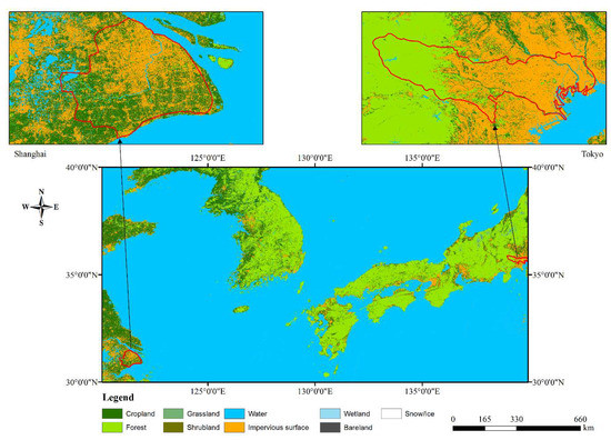 The spatial locations and land cover map for Shanghai and Tokyo (Land cover data in 2017, FROM-GLC10, was downloaded for free from http://data.ess.tsinghua.edu.cn).