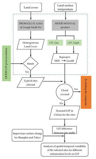 According to the land cover data, GAIA data, and Google Earth Pro, there were little land cover changes for the Imperial Palace in Tokyo and the People’s Square in Shanghai (Figure 2). The land covers in these urban cores were assumed to be unchanged during the study period. Then representative sites distant from the core centers, i.e., Imperial Palace in Tokyo and People’s Square in Shanghai, were selected with auxiliary information such as elevation for studying the effects of different land cover changes on LST. A circle with a radius of 0.5 km centered at every site was used to determine land cover, which ensured the representative sites matching the spatial resolution of the MODIS LST product (Figure 2 and Figure 3 and Table 1 and Table 2). In this study, the spectral contribution of one land cover such as impervious surfaces were heavily weighted in a circle, which would be identified as impervious surface. Extreme cloudiness made it difficult and challenging to compare urbanization effects on LST variations in Tokyo and Shanghai. If any 8-day composite had a pixel contaminated by cloud for any site, the MODIS LST data would not be used for further analysis in this study. In other words, the variations of LST during the day, at night, and the difference of LST between day and night were analyzed when the LST values for both daytime and nighttime per site were normal. Practically, the prerequisite that the LST values for both daytime and nighttime for every site must be normal could partly ensure that the viewing time of the products used were in good weather condition in such subtropical marine monsoon climate. The original MODIS LST product gives temperature in degree Kelvin. In this study, the LST values in Kelvin was converted to Celcius temperature. In order to reduce the influence of singular values, the seasonal and annual mean LST were calculated. The research process is shown in Figure 3.