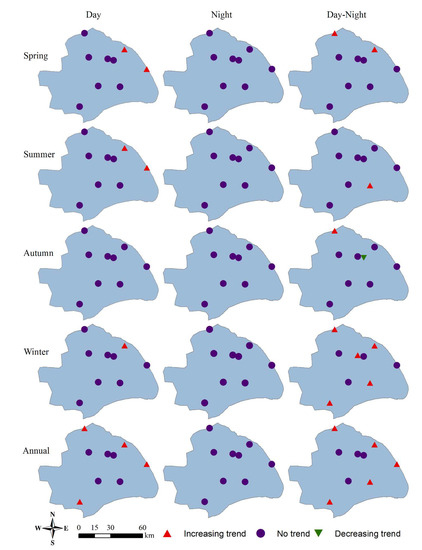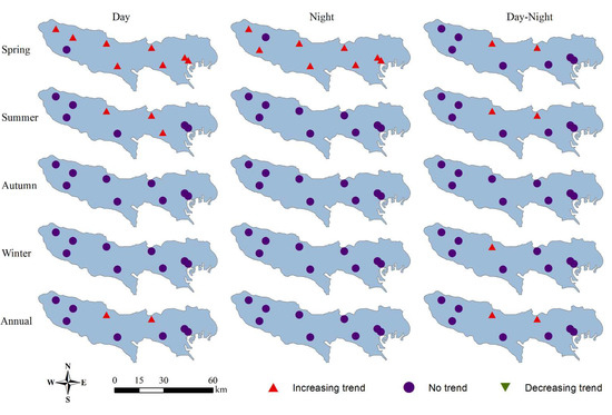 The nonparameteric Mann-Kendall statistical test and Sen’s slope estimator, which are popular for detecting the trends of change in climate and hydrology study [34,35], were adopted to analyze the trends of LST changes.