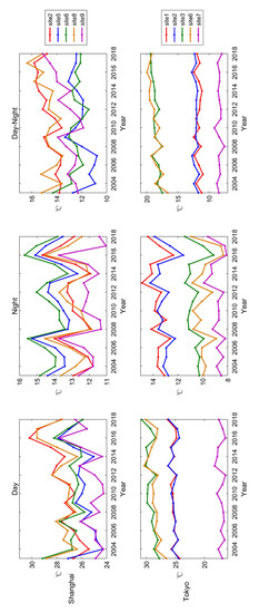 From Sen’s slope estimator and the Mann-Kendall test, there was slight increase of annual mean LSTday for most sites in Tokyo (Figure 5 and Table 7). The rising trend of annual mean LSTday was distinct for sites 3 and 6, which were mainly covered by impervious surfaces. Site 2 was a big park used for Japanese Imperial Palace with dense vegetation, and the change in annual mean LSTday was not significant. There was no obvious trend of change for annual mean LSTnight (Figure 5 and Table 8). To an extent, the annual mean LSTnight change in a developed megacity such as Tokyo kept relatively stable. The annual mean LSTdiff for most sites had the same trend similar to annual mean LSTday despite different land covers (Figure 5 and Table 9).