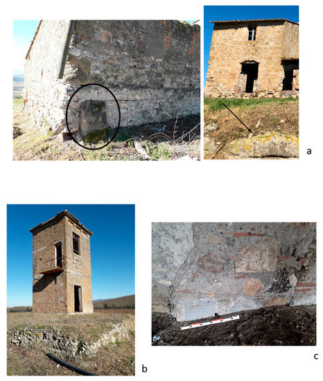 The site of Malvicino, including modern constructions. (a) The pigsty with probable ancient masonry blocks still in situ (circled in black) and the remains of the retaining wall or partially preserved cistern (indicated by the black arrow). (b) The electrical tower standing on top of a platform that is partially constructed of opus caementicium. (c) Ancient Roman fragments reused to decorate the walls of the modern farmhouse.