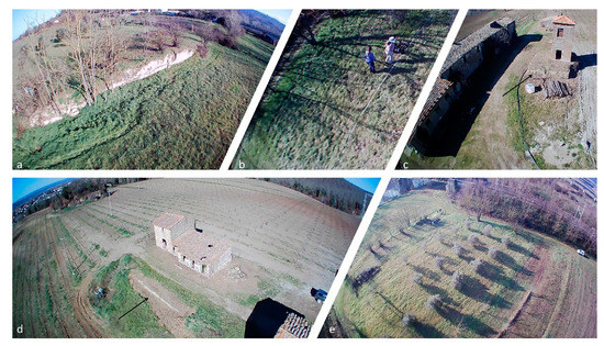 Drone-borne imagery. (a) The wall and the olive grove (San Valentino). (b) The parch marks on which the grass is less green (San Valentino). (c) The opus caementicium foundation of the electrical tower can be seen (Malvicino). (d) The retaining wall/cistern in front of the pigsty (Malvicino). (e) On the right side, the dispersion of the ancient sherds can be seen, which are particularly visible due to the reddish color of the superficial soil (San Valentino).