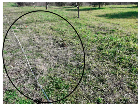The fieldwork included the use of a drone to not only observe the presence of parch marks from above, but also to map the dispersions of ancient potsherds, tiles, and other materials, and to establish the best possible conditions for geophysical prospecting (Figure 4). The drone was also useful in obtaining a better understanding of the general orientation of the wall, as mentioned above, in relation to the Tiber river (Figure 4a). Even though the reddish sherds were already visible to the naked eye, the drone confirmed their dispersion throughout the field, as they had changed the color of the superficial soil from brown to reddish (Figure 4e). However, no particular parch marks were noticed except at some sporadic points (Figure 4b and Figure 5), which were later investigated by geophysical prospections.