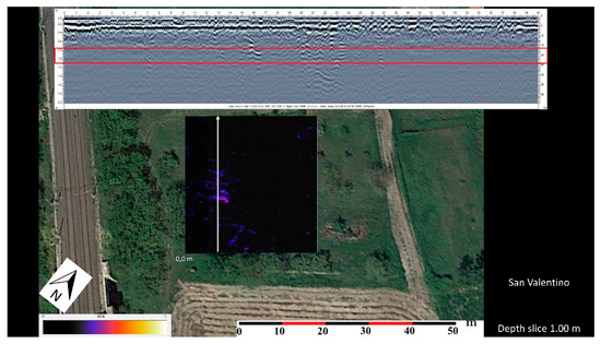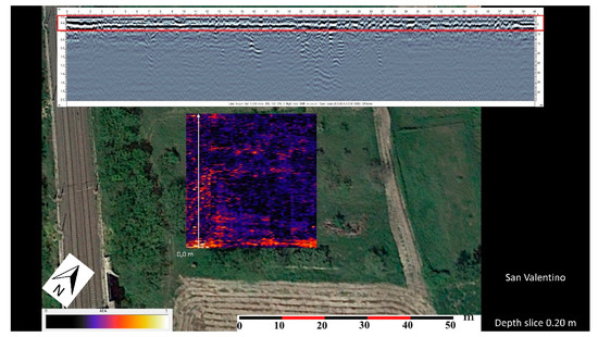 The surface of the ground was initially probed using a metal detector to detect ancient objects and, above all, to eliminate the areas where modern metal elements could disturb the subsequent passage of the GPR. The only result was a fragment of shrapnel, probably from a World War II bomb; this area was heavily bombed during WWII due to the presence of the railway [38].