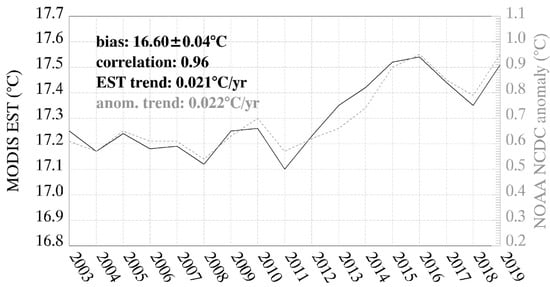 MODIS Earth surface temperature (EST) absolute temperatures versus the NOAA’s National Climatic Data Center (NOAA-NCDC) anomalies for the period 2003–2019. Both datasets estimate positive trends, which are, respectively 0.021 °C/yr for MODIS EST and 0.022 °C/yr for NOAA-NCDC and their correlation coefficient is 0.96.