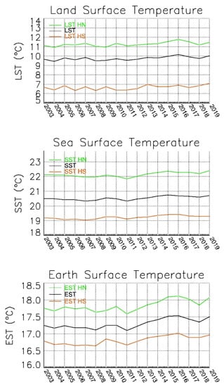 Land surface temperature (LST), seas surface temperature (SST) and EST evolution in the northern hemisphere (NH) (green) and southern hemisphere (SH) (orange) hemispheres and global (black) from 2003 to 2019. Notice how the highest temperatures are obtained for the EST, LST and SST in the NH and the lowest for the SH.
