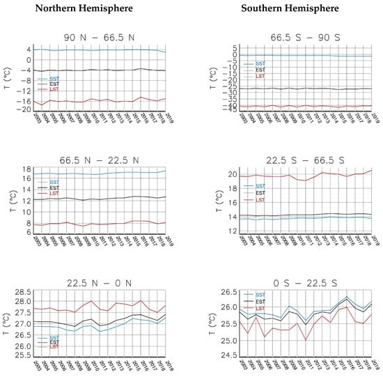 In Figure 3, SST, LST and EST are shown for the six latitudinal zones considered. The results are very similar to those observed in [], with the inclusion of years 2017, 2018 and 2019. In general, the curves show a decrease in temperature from 2016 to 2018 followed by an increase in 2019. Thus, SST curves show a smoother behavior than LST curves. Sea surface is significantly higher than land surface at low and mid latitudes in NH and at low latitudes in the SH, therefore the final EST curve is closer to SST than to LST.
