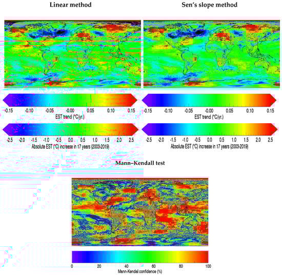 Finally, Figure 4 shows the global trend maps estimated by both linear and Sen’s slope methods, for the period 2003–2019. A large area on the North Atlantic next to Greenland displays a decreasing SST. However, the remaining areas show an increase in their SST compared to the results derived from [] with a Mann–Kendal level significance of 99.7%. Particularly significant are the areas in red that imply temperature increases greater than 2 degrees, over the 17-year period analyzed.