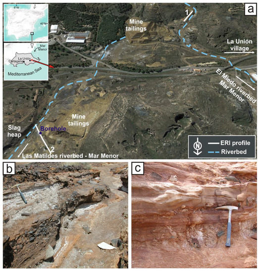 At the dry riverbed site, a ~4-m-thick upper unit of low resistivity values and a ~3.5–4-m-thick lower unit of higher resistivity values were distinguished and respectively correlated with surficial mine tailings and underlying riverbed sediments. The highest resistivity values correspond to the metasediments located below the two previous units. These results are in good agreement with borehole data. Significant amounts of pyrite, sphalerite, and galena were identified in the borehole samples, and are much more concentrated in the tailings upper levels than in the sediment’s lower ones. The alluvial material from the riverbed showed significant toxic metal contents (As, Cd, Fe, Pb, and Zn) as well. Mineralogical and geochemical data have proved the important removal of pollutants by water erosion from mine waste deposits that finally reach the water courses. In fact, rock and metallurgical wastes alter the drainage pattern and bury the headwaters of ephemeral channels. The strongly seasonal character of the Mediterranean climate, which concentrates almost all the annual rainfall in heavy, episodic storms, increases the potential hazard in this area. Thus, strong water erosion and the transport of extremely contaminated tailings (Igeo) affect the agricultural soils and the Mar Menor, one of the most important touristic destinations in SE Spain. Both reclamation of the Cartagena–La Unión mining district and intensive monitoring of waters and soils are highly recommended to recover one of the most problematic yet tourist-popular areas of SE Spain from the environmental point of view.