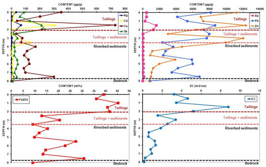 The geochemistry of the sampled mine tailings and riverbed sediments matches the described mineral abundances and geophysical features well. Distribution with depth plots of these geochemical data (Figure 5) clearly shows the three-level structure previously described: tailings from the surface down to a 2.0 m depth, tailings mixed with riverbed deposits from 2.0 to 3.5 m depth, and riverbed deposits from 3.5 to 7.5 m depth. High contents of Fe, Pb, Zn, and other heavy and transitional metals characterize the composition of all borehole samples. The total iron content ranges from 9.1 to 45.3 wt%, Pb from 2340 to 8640 µg/g, and Zn from 897 to 12,310 µg/g. Other trace elements also show high contents: As (up to 1620 µg/g), Cd (up to 306 µg/g), Cu (up to 730 µg/g), and Sb (up to 236 µg/g). These significant amounts are due to the nature of the deposits, composed of pyrite, sphalerite, galena, and cassiterite. [43] reported similar trace element contents in other riverbeds of the district. The metamorphic host rock (8 m depth) in turn displays significantly lower amounts of metals, as is usually the case in mine deposits [2,14]. Variation in trace element trends and iron contents are related to the textural features and mineralogical composition previously described in Section 4.3. The highest values are generally observed to be associated with the surficial level (0–2 m), representing mine tailings directly stored over the riverbed sediments. The highest Ag, As, Fe, Pb, and Zn contents are clearly located at this uppermost level (Figure 5).