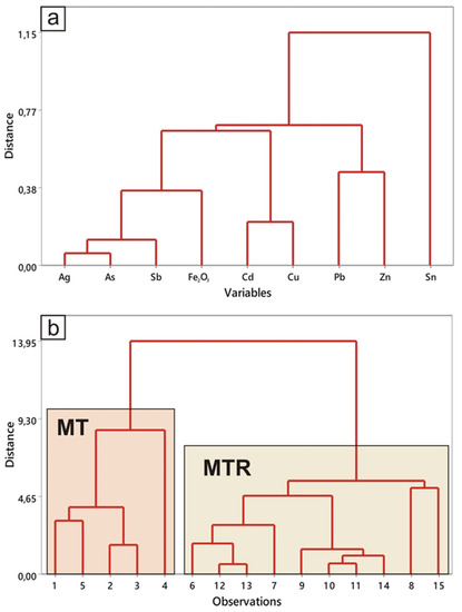 Statistical data processing was done using Minitab 17 software (Minitab Ltd., Brandon Court, Unit E1-E2, Progress Way, Coventry CV3 2TE, United Kingdom). The multivariate analysis was based on clustering (group average linkage dendrograms, Euclidean distance) of the set of samples and significant metals (Ag, Sb, Fe, Cd, Cu, Pb, Zn, and Sn) plus As.
