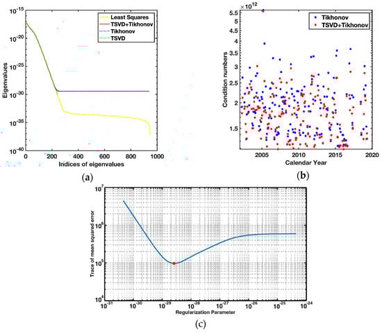 Figure 2a shows the eigenvalues of the normal equation with the 1° resolution with different methods in January 2004. It should be noted that the choice of regularization parameter and truncation value may bias the mass variations derived from the combined method, TSVD, or Tikhonov regularization. To compare the combined solution with other solutions, we did not truncate the normal equation with Tikhonov regularization only (Figure 2a, blue dotted line) and derived the optimal regularization parameter based on the criterion of minimizing the traced MSE. Note that the regularization parameters of the combined method and Tikhonov regularization are separately calculated for each month. The truncating parameter k of TSVD solutions is chosen according to the MSE criterion in each month []. We further compared the condition numbers by the combined method, and Tikhonov regularization, respectively in Figure 2b. The condition numbers by the combined methods were reduced slightly more compared to those by Tikhonov regularization during 2002 to 2019. Figure 2c presents how traced MSE of the combined method varies with the regularization parameter in January 2004. The regularization parameter of 1.6 × 10−29 is selected by the minimum traced MSE.
