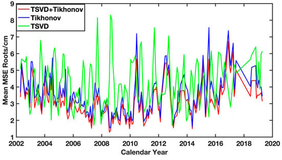 Here we introduced MSE, which is one of the most common measures to describe how methods perform in parameter estimation. Estimators (i.e., mascons in our case) with a smaller MSE, indicate that they are expected to have a closer distance to the true value. To compare the performance of each method in the parameter space, we calculated the MSE roots of 946 mascons in the TP using the combined method with Equation (12), those by TSVD according to Xu [], and those by Tikhonov regularization according to Shen and colleagues []. Figure 3 shows the MSE roots in EWH (cm) of all mascons for each month. Except for a few months, the combined method has a better performance than Tikhonov regularization. The maximum MSE roots of 946 mascons were successfully reduced from 8.31 cm in the case of TSVD to 6.74 cm in the case of the combined method. The maximum MSE root by Tikhonov regularization is equal to 7.56 cm. The MSE roots of 3.08 cm by the combined method is smaller than those of 4.23 cm and 3.53 cm by TSVD and Tikhonov regularization, respectively (Table 1). In other words, the improvements are 27.2% and 12.7% for the combined method over TSVD and Tikhonov regularization.