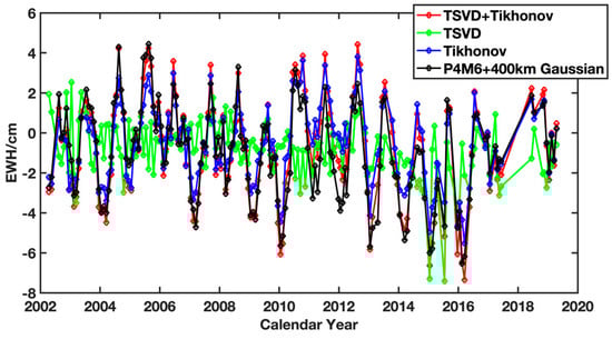 As expected, the time series of mass flux solution in the TP (i.e., within the black boundary in Figure 1) from April 2002 to April 2019 exhibited strong annual changes with a decreasing secular trend at a rate of −5.6 ± 4.2 Gt/year, −7.9 ± 3.9 Gt/year, −6.8 ± 5.2 Gt/year, and −8.6 ± 5.8 Gt/year with combined TSVD and Tikhonov regularization, TSVD only, Tikhonov regularization only, and P4M6 + 400 km Gaussian filtering [,,] applying to mass points exactly those used in the combined method, respectively (Figure 4). Note that the TSVD solution suffers unrealistic south-north strips (see Figure 5d), indicating that using TSVD alone is not suitable to recover mass flux solution in the TP.