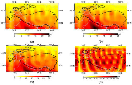 where, A1, A2, A3, , , stand for the annual, semi-annual, and 161-day amplitudes and phases; t is the time tag in years; b is bias parameter; is the residuals. We realize that Equation (14) represents a mathematical model that enables an unbiased trend estimate, rather than a tool for assessing solution errors in the presence of real geophysical signals which do not necessarily follow this model. However, we argue that (1) it is indeed our primary aim to derive the mass trends, and (2) several modeling studies have confirmed that a trend plus (semi-) annual model describes snow accumulation, groundwater, and surface water change in the TP region quite well [,].