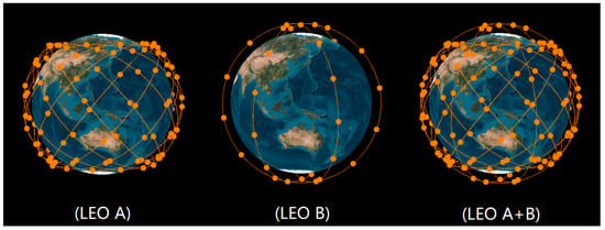 Designed low Earth orbit (LEO) constellation simulation. LEO A and B are two LEO sub-constellations, and LEO A+B is an integrated LEO constellation.
