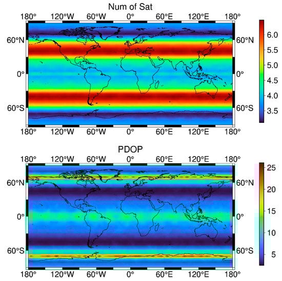 Figure 1 shows the simulation for the designed LEO constellation, which consists of A and B, two sub-constellations. Figure 2 depicts the global distribution for the average number of the visible satellite and the position dilution of precision (PDOP) of the designed LEO constellation. The global distribution of the average number of visible LEO satellites and PDOP values shown in Figure 2 is consistent. It can be seen that the number of visible LEO satellites and the PDOP value are better in the middle latitudes’ region than in the low latitudes’ region, and better in the low latitudes’ region than in the high latitudes’ region. Therefore, the combination constellation designed in this study allowed more LEO satellites to be observed in the regions of middle latitudes and several satellites to be observed in polar regions.