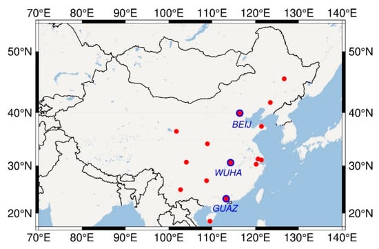 Distribution of regional ground tracking stations. The red dots denote the ground stations for LEO satellite clock estimation, and the blue dots denote the ground stations for LEO-augmented Global Navigation Satellite System (GNSS) precise point positioning (PPP).