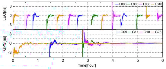 Figure 4 shows the convergence series of the segmental LEO satellite clock compared with GPS satellite within 6 h for DOY 305, 2019, after the removal of satellite-specific mean biases. L in front of the pseudo random noise (PRN) number indicates the LEO satellite. It can be clearly observed that GPS satellites were tracked continuously for several hours, whereas most of LEO satellites were interrupted for approximately 20 min in Figure 4. The solution of GPS satellite clock was regarded as being converged when the clock difference remained less than the threshold of 0.2 ns for more than 5 min in this study. It was obviously not suitable to use the convergence threshold of the GPS satellite for LEO satellite. Therefore, we used the triple-mean square error of LEO satellite clocks for the last 3 min tracked using ground stations as the threshold of convergence. Because the averaged triple-mean square error for LEO satellite clocks is 0.79 ns, the threshold of convergence was set as 0.8 ns and the continuous-time was set as 1 min for LEO. The convergence time of the GPS satellite clock was approximately 30 min, whereas the time of the LEO satellite clock was only within 3 min in Figure 4. The faster convergence of the LEO satellite clock resulted from the lower orbital altitudes and faster motion of LEO satellites compared with those of GPS satellites.